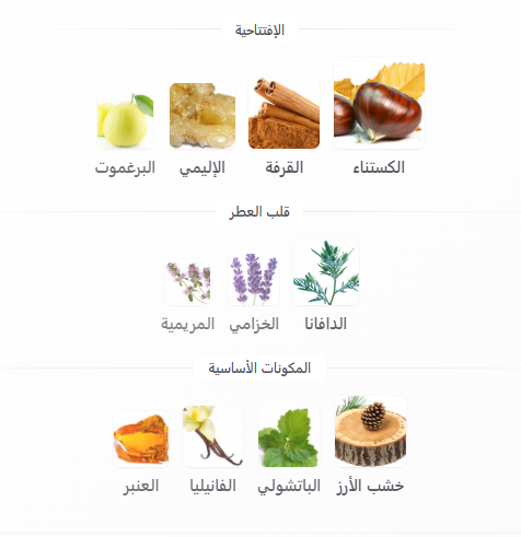 قاعدة العطر: العنبر – الفانيليا – الباتشولي – خشب الأرز